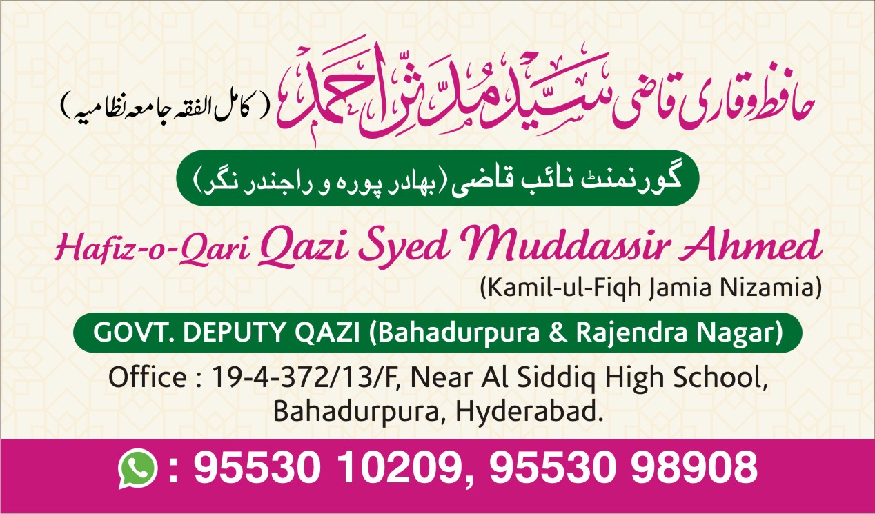 Qazi Syed Muddassir Ahmed in Hyderabad, Tolichowki, Bahadurpura, Suncity, Moinabad, Rangareddy, Rangareddy, Mahabubnagar, Warangal, Nagarkurnool, Moinabad | Qazi in Hyderabad, Tolichowki, Bahadurpura, Suncity, Moinabad, Rangareddy, Rangareddy, Mahabubnagar, Warangal, Nagarkurnool, Moinabad | Kazi in Hyderabad, Tolichowki, Bahadurpura, Suncity, Moinabad, Rangareddy, Rangareddy, Mahabubnagar, Warangal, Nagarkurnool, Moinabad | Khazi in Hyderabad, Tolichowki, Bahadurpura, Suncity, Moinabad, Rangareddy, Rangareddy, Mahabubnagar, Warangal, Nagarkurnool, Moinabad | Marriage Certificate Agents in Hyderabad, Tolichowki, Bahadurpura, Suncity, Moinabad, Rangareddy, Rangareddy, Mahabubnagar, Warangal, Nagarkurnool, Moinabad | Marriage Certificate correction in Hyderabad, Tolichowki, Bahadurpura, Suncity, Moinabad, Rangareddy, Rangareddy, Mahabubnagar, Warangal, Nagarkurnool, Moinabad | Marriage Registrar Consultant in Hyderabad, Tolichowki, Bahadurpura, Suncity, Moinabad, Rangareddy, Rangareddy, Mahabubnagar, Warangal, Nagarkurnool, Moinabad | Marriage Certificate In 24 Hours in Hyderabad, Tolichowki, Bahadurpura, Suncity, Moinabad, Rangareddy, Rangareddy, Mahabubnagar, Warangal, Nagarkurnool, Moinabad | Muslim Marriage Registrar Consultant in Hyderabad, Tolichowki, Bahadurpura, Suncity, Moinabad, Rangareddy, Rangareddy, Mahabubnagar, Warangal, Nagarkurnool, Moinabad | Certificate Translation Services in Hyderabad, Tolichowki, Bahadurpura, Suncity, Moinabad, Rangareddy, Rangareddy, Mahabubnagar, Warangal, Nagarkurnool, Moinabad | Love Marriage Registrar in Hyderabad, Tolichowki, Bahadurpura, Suncity, Moinabad, Rangareddy, Rangareddy, Mahabubnagar, Warangal, Nagarkurnool, Moinabad | Arrange Marriage Registrar in Hyderabad, Tolichowki, Bahadurpura, Suncity, Moinabad, Rangareddy, Rangareddy, Mahabubnagar, Warangal, Nagarkurnool, Moinabad | Mutual Khula in Hyderabad, Tolichowki, Bahadurpura, Suncity, Moinabad, Rangareddy, Rangareddy, Mahabubnagar, Warangal, Nagarkurnool, Moinabad | Khula certificate in Hyderabad, Tolichowki, Bahadurpura, Suncity, Moinabad, Rangareddy, Rangareddy, Mahabubnagar, Warangal, Nagarkurnool, Moinabad | Certificate attestation in Hyderabad, Tolichowki, Bahadurpura, Suncity, Moinabad, Rangareddy, Rangareddy, Mahabubnagar, Warangal, Nagarkurnool, Moinabad | Certificate notary in Hyderabad, Tolichowki, Bahadurpura, Suncity, Moinabad, Rangareddy, Rangareddy, Mahabubnagar, Warangal, Nagarkurnool, Moinabad |